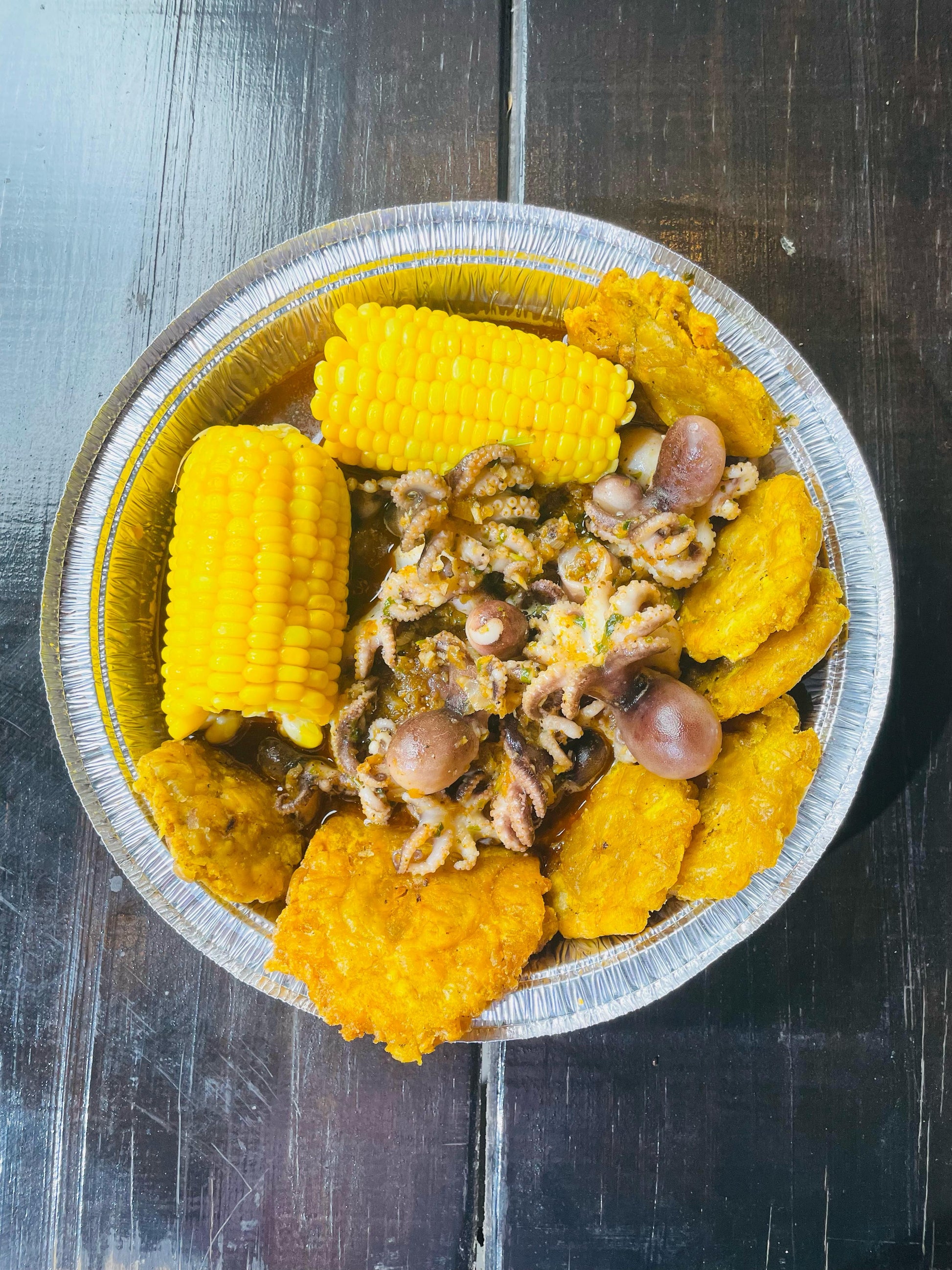 Pulpo Al Ajillo o Cajun, acompañado de Tostones o Yuca y Ensalada Verde o Elote